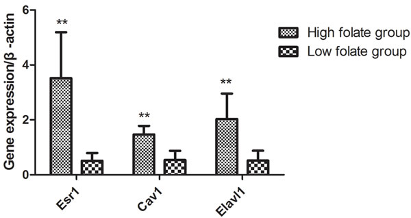 Figure 4: Effect of low folate level in human seminal fluid on gene expression of Esr1, Cav1 and Elavl1, **P < 0.01.