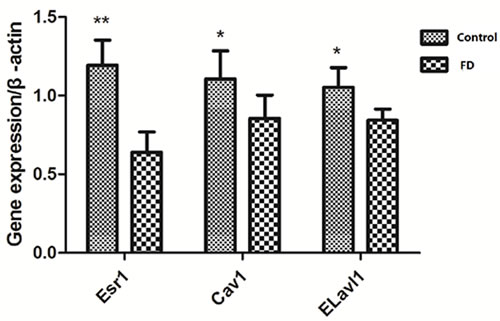 Figure 5: Effect of low dietary folate on gene expression of Esr1, Cav1 and Elavl1 of mice, FD: folate deficiency, **P < 0.01, *P < 0.05.