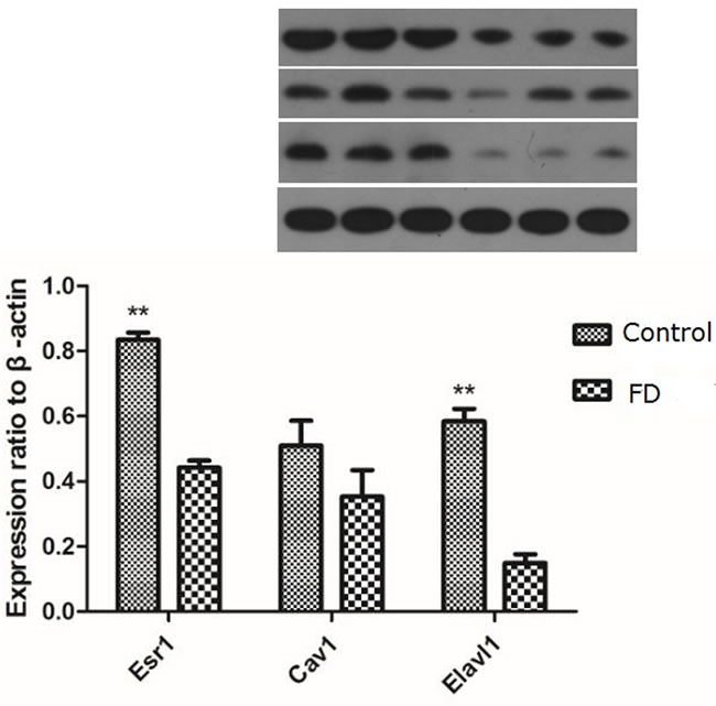 Figure 6: Effect of low dietary folate on Expression levels of Esr1, Cav1 and Elavl1 proteins in each mice group, FD: folate deficiency, **P < 0.01.