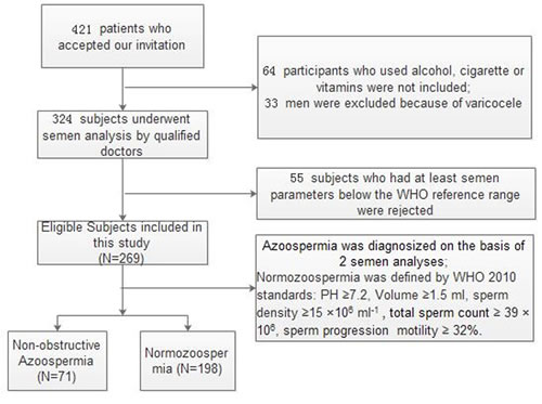 Male subfertile patients, aged 18 to 55 years, who attended the out-patient clinic of Wuhan Tongji Reproductive Medicine Hospital, were invited to participate in this study from March to August 2015. After the physical examination, all subjects were asked to fill out a questionnaire to collect the following data: age, medical history, body mass index (BMI), ethnicity, alcohol and cigarette use, abstinence length, and vitamin supplements. Participants who used alcohol, cigarettes, and vitamins or had varicocele were excluded in this study to avoid the effects of lifestyle factors, vitamin supplements and varicocele on semen parameters. Figure 8 presents the screening process of the study participants.