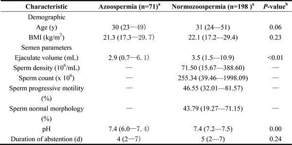 A total of 269 participants, including 71 patients with azoospermia and 198 with normozoospermia, were enrolled in this study. Table 1 summarizes the general characteristics and semen variables of the screened subjects. The median age of all study subjects was 31 years old (range, 23-51); the median value of BMI was 22.0 (range, 17.2-29.7); and the median abstinence time was 5 days (range, 2-7). Men with normozoospermia were older than those with azoospermia, but the difference in age was not significant. However, the semen volume of subjects with azoospermia was smaller than that of normozoospermic men (p < 0.01). Among those with azoospermia, five males exhibited semen pH < 7.2 (7%).
