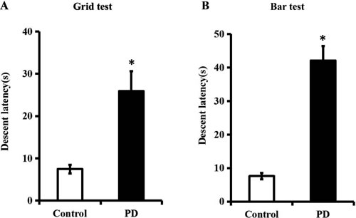 Figure 1: Descent latency is significantly prolonged in a rat model of PD. A rat model of PD was established using a four-week infusion of rotenone (2.5 mg/kg/d). A. and B. Descent latency of control and PD group in the grid test and the bar test was recorded. n = 6 per group. Data were analyzed by independent samples t test. Columns represent mean±SD. *P < 0.05 vs. control group.