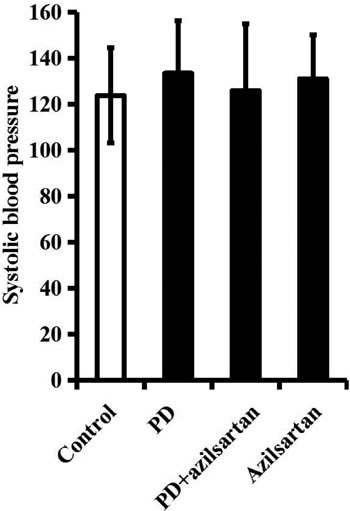 Figure 2: Rotenone and (or) azilsartan treatment does not influence the SBP of rats. The SBP of rats in control group, PD group, PD + azilsartan (5 mg/kg/d) group or control + azilsartan (5 mg/kg/d) group was tracked by a tail cuff method. n = 6 per group. Data were analyzed by one-way ANOVA followed by Tukey’s post hoc test. Columns represent mean±SD.