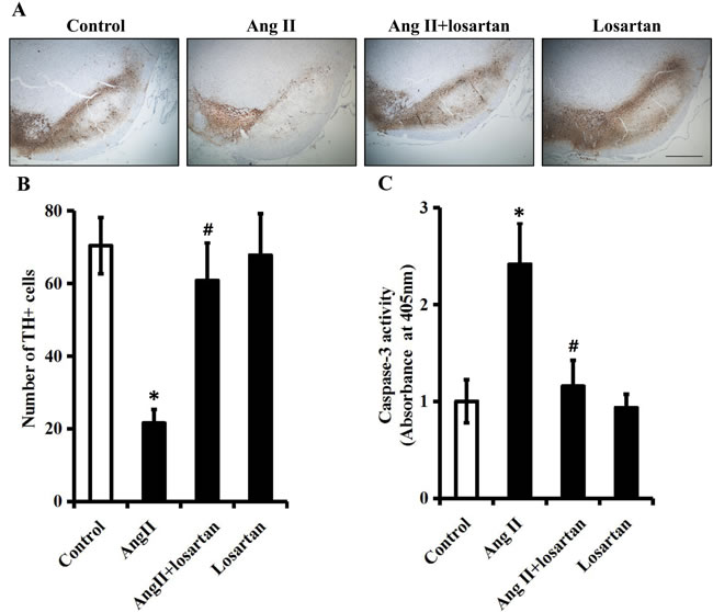Figure 5: Exogenous Ang II triggers apoptosis of dopaminergic neurons via an AT1R-dependent manner in the right SN of rats. The right SN of rats were infused with vehicle, Ang II (60 ng/h), Ang II (60 ng/h) + losartan (200 ng/h) or losartan (200 ng/h) for one-week. A. TH-immunoreactive neurons in the right SN of each group. Scale bar: 500 μm. B. Quantitative analysis of TH-positive neurons in the right SN of each group. C. The activity of caspase-3 in the right SN of each group was measured by a colorimetric assay kit. n = 6 per group. Data were analyzed by one-way ANOVA followed by Tukey’s post hoc test. Columns represent mean±SD. *P < 0.05 vs. control group, #P < 0.05 vs. Ang II group.