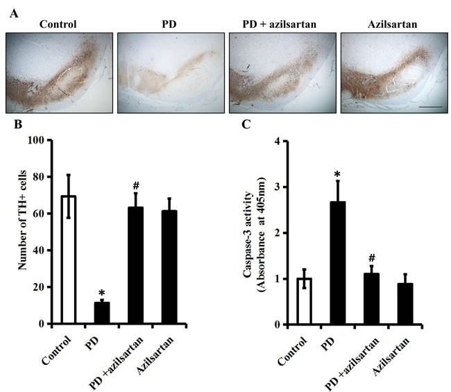 Figure 6: Oral administration of a novel AT1R blocker azilsartan ameliorates the apoptosis of dopaminergic neurons. Rats were orally administered with vehicle or azilsartan (5 mg/kg/d) during the four-week rotenone (2.5 mg/kg/d) infusion. A. TH-immunoreactive neurons in the SN of each group. B. Quantitative analysis of TH-positive neurons in the SN of each group. Scale bar: 500 μm. C. The activity of caspase-3 in the SN was measured by a colorimetric assay kit. n = 6 per group. Data were analyzed by one-way ANOVA followed by Tukey’s post hoc test. Columns represent mean±SD. *P < 0.05 vs. control group, #P < 0.05 vs. PD group.