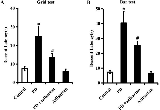 Figure 7: Azilsartan rescues characteristic parkinsonian behaviors in a rat model of PD. Rats were orally administered with vehicle or azilsartan (5 mg/kg/d) during the four-week rotenone (2.5 mg/kg/d) infusion. A. and B. Descent latency of each group in the grid test and the bar test was recorded. n = 6 per group. Data were analyzed by one-way ANOVA followed by Tukey’s post hoc test. Columns represent mean±SD. *P < 0.05 vs. control group, #P < 0.05 vs. PD group