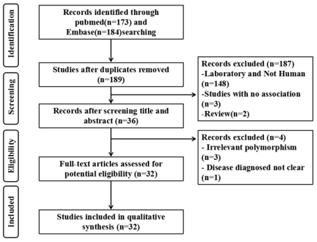 Following an initial search, after duplicates removed, 189 studies were retrieved (PubMed: 173, Embase: 184). 6 review and 151 irrelevant studies and were excluded. Finally, 32 studies (6950 cases and 7984 controls) were chosen, and the data were extracted. A flow chart were carefully identified of the search process in Figure 1. The departure of Bcl-2 promoter polymorphisms frequencies from expectation under Hardy-Weinberg equilibrium (HWE) was assessed by chi-square in control group, and it was considered to be disequilibrium if P< 0.05. Six studies were excluded by HWE expectation (P< 0.05). The genotype distributions of all studies are summarized in Supplementary Table 1-3.
