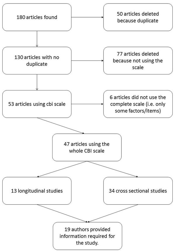 The inclusion criteria were papers in all languages that have reported administering the CBI or a modified version of the CBI, and were published in peer-reviewed journals or published dissertation thesis. Exclusion criteria were papers not administering the CBI, administering only few factors of the scale, duplicate papers, commentaries, book chapters, literature reviews, clinical guidelines, conference proceedings or abstracts and study protocols.