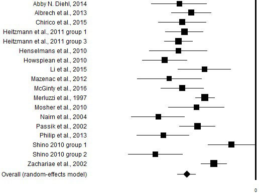 Random effects meta-analysis was conducted using the Prometa3 software (Internovi 2015). Where CBI scales were scored such that higher scores indicated higher self-efficacy for coping with cancer, the sign of the correlation coefficient was changed to ensure consistency with measures of stress (i.e., measures of distress or adjustment were reversed in order to have uniform interpretation of the results) and QoL. In cases were studies reported multiple effect sizes (e.g.,multiple rs), they were examined to determine whether the effect sizes were independent of one another before utilizing both. For example, a study that utilized three different cancer patient samples from different locations and reported three different correlation coefficients between self-efficacy and distress would be considered independent and were coded as three different effect sizes. Pooling was undertaken based on the Fisher’s z transformation of the correlation coefficient, where the standard error was calculated as 1/
