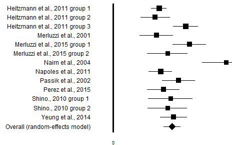 Fourteen studies evaluated self-efficacy for coping with cancer in longitudinal designs. Because the focus of this meta-analysis was on the relationship of the CBI with QoL and distress, longitudinal studies were included in the cross-sectional analysis if those relationships were reported or could be determined. However, some studies did not include information about correlation of the CBI with either QoL or distress during any of the time points of the study and , therefore, those studies were evaluated in terms of the change in the CBI over time in observational studies or due to an intervention. Some studies did not investigate any psychological outcomes in relationship with self-efficacy for coping with cancer. In other studies self-efficacy for coping with cancer was investigated as moderator or mediator in relationship with other outcome variables (no QoL or distress evaluated in any time points of the study).