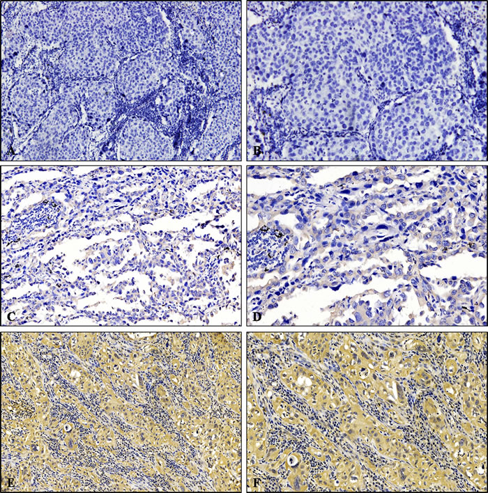 Two investigators evaluated the samples independently and were unaware of the clinical data of all patients. The scoring of cripto-1 expression was conducted according to the intensity of staining and the proportions of positive tumour cells: (a) staining intensity score (score of 0, negative staining; score of 1, weak staining, light yellow; score of 2, intermediate staining, yellow brown; and score of 3, strong staining), (b) the percentage of positive tumour cells (score of 0, < 5%; score of 1, 5%-20%; score of 2, 21%-50%; score of 3, 51%-75%; score of 4, > 75%). Cripto-1 expression was calculated by a+b, which means that the score ranged from 0 to 7. The samples were then categorized into two groups according to those scores, as follows: a score of less than or equal to 3 indicated low expression, and a score greater than 3 indicated high expression. The scoring criteria for E-cadherin in NSCLC have been described previously [28]. When ≥50% of the carcinoma cells in a given specimen were positively stained for E-cadherin, the sample was classified as E-cadherin-positive. Conversely, when < 50% of the cells were stained, the specimen was classified as E-cadherin-negative. If a discrepancy occurred with some samples, then the slides were reviewed again, and a consensus was reached.