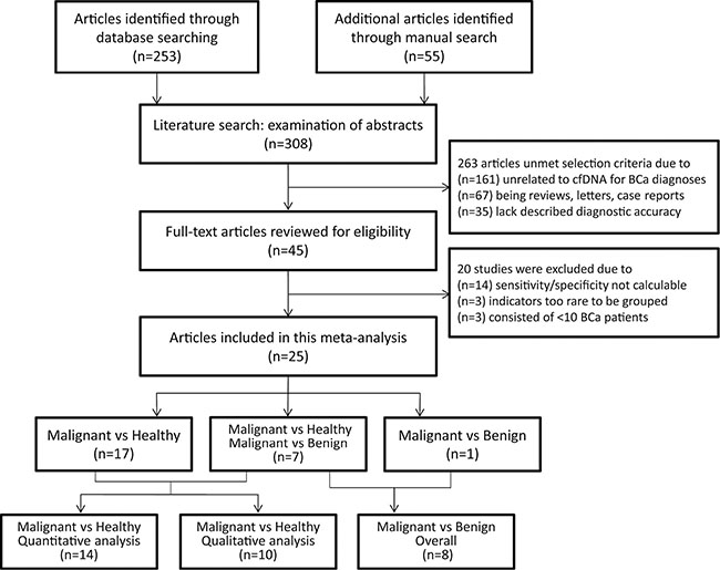 In primary review, a total of 45 publications dealing with abnormal concentration [8, 17–36], methylation alterations [37–44], microsatellite instability [45–50] and other characteristics [10, 14, 51–58] of plasma or serum DNA for the diagnosis of breast cancer were retrieved. After full-text review, 20 studies [8, 10, 14, 29–35, 42–44, 48–50, 56–59] were excluded because they did not allow the calculation of sensitivity or specificity, included very rare indicators, or consisted of less than 10 breast cancer patients (Figure 1).