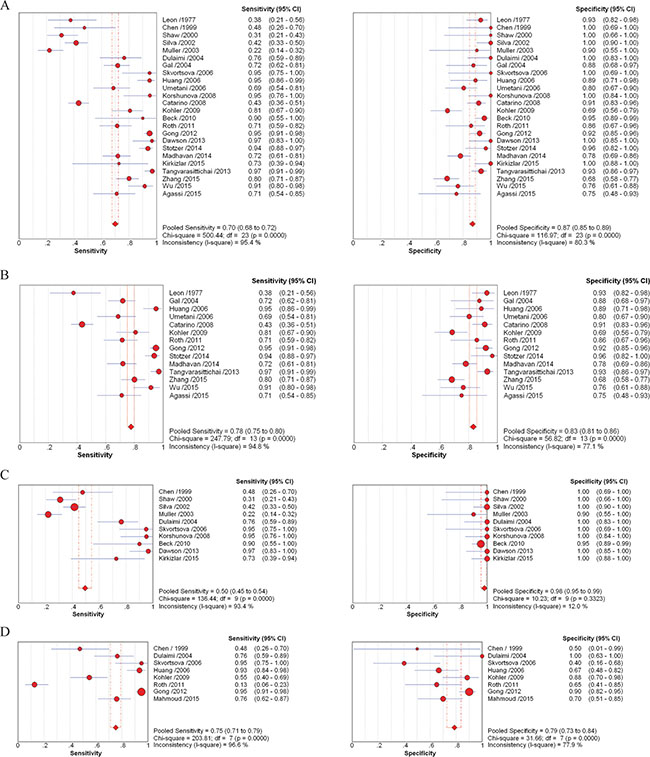 Figure 2: Forest plots of estimates of sensitivity and specificity for different cell-free DNA assay groups. Forest plots of sensitivity and specificity for assays of circulating cell-free DNA in the diagnosis between healthy individuals and breast cancer patients (A), and between benign breast disease and breast cancer patients (D). Forest plots of sensitivity and specificity for methodological groups using quantitative (B) and qualitative (C) analysis of circulating cell-free DNA in the diagnosis of breast cancer.