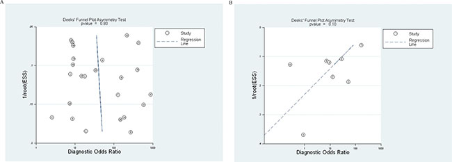 Figure 4: Funnel graphs for the assessment of potential publication bias in cell-free DNA assays. Funnel graphs for the assessment of potential publication bias in cell-free DNA assays to distinguish breast cancer patients vs. healthy individuals (A), and assays to distinguish breast cancer vs benign breast disease patients (B). The funnel graph performs linear regression of log odds ratios on inverse root of effective sample size (ESS).