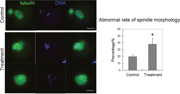 Figure 3: Citrinin toxin exposure affected spindle formation in mouse oocytes. In the control group, the oocyte spindle exhibited normal morphology; while in the treatment group, the oocyte spindle showed aberrant spindle with mis-aligned chromosomes. The analysis data showed that the abnormal rate of spindle morphology increased significantly after citrinin toxin treatment, p<0.05.