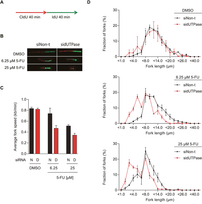 Figure 3: 5-FU treatment decreases replication fork speed, which is enhanced by dUTPase depletion. (A) Schematic illustration of CldU (red) and IdU (green) labeling during the DNA fiber assay. (B) Representative images of DNA replication fibers from dUTPase depleted and control cells treated with the indicated concentration of 5-FU. (C) Average fork speed during IdU labeling in dUTPase depleted and control cells after 48 hours of 5-FU treatment. Data shown as average ± SEM from three independent experiments. Abbreviations: N: siNon-t, D: sidUTPase. (D) Distribution of IdU labeled fiber length in dUTPase depleted and control cells. Data shown as average ± SEM from three independent experiments.