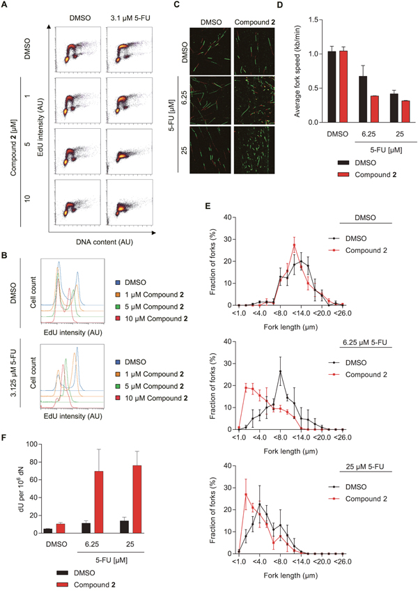 Figure 6: The dUTPase inhibitors increase 5-FU efficacy by increasing dU in DNA and reducing replication fork speed. (A) FACS analyses measuring the EdU incorporation of SW620 cells treated for 48 hours with 3.1 μM of 5-FU in combination with increasing doses of compound 2. EdU intensity is depicted on the y-axis and DNA content (To Pro intensity) on the x-axis. A representative experiment is shown. (B) Representative histograms displaying the EdU intensity of the experiment shown in Figure 6A. The intensity of the PI staining is depicted on the x-axis and events (cell count) on the y-axis. Abbreviation: AU: arbitrary unit. (C) Representative images of DNA replication forks from cells treated with the indicated concentration of 5-FU or DMSO in combination with 10 μM of compound 2 or a DMSO control for 48 hours. (D) Average fork speed during IdU labelling of cells treated as described in Figure 6C. Data shown as average ± SEM from two independent experiments. (E) Distribution of IdU labelled fiber length of the experiment shown in Figure 6C–6D. Data shown as average ± SEM from two independent experiments. (F) dU content in SW620 cells treated for 48 hours with the indicated concentration of 5-FU in combination with compound 2 or DMSO, by mass spectrometry. Data shown as average ± SEM from three independent experiments.