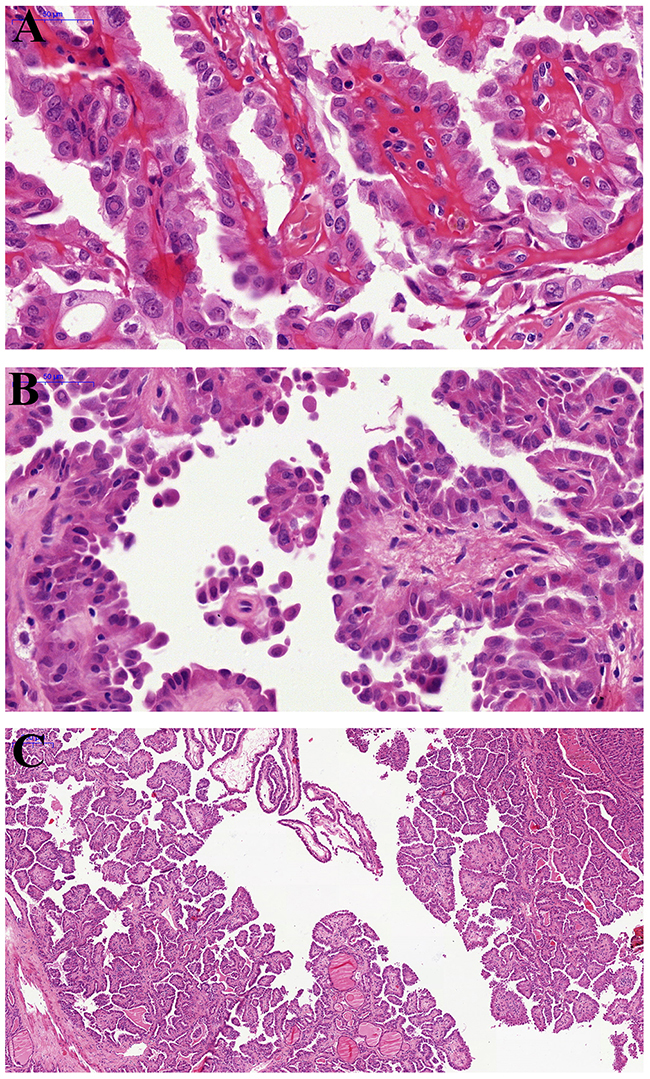 Figure 1: Pathological findings of hobnail variant papillary thyroid carcinoma. (A) The papillary architecture and characteristic nuclear features of papillary carcinoma: pseudoinclusions and nuclear grooves. (B) Micropapillary structures lined by cuboidal cells with apically placed nuclei (“hobnail”appearance) and loss of cellular cohesion. (C) The papillary architecture with focal micropapillary areas at low magnification.