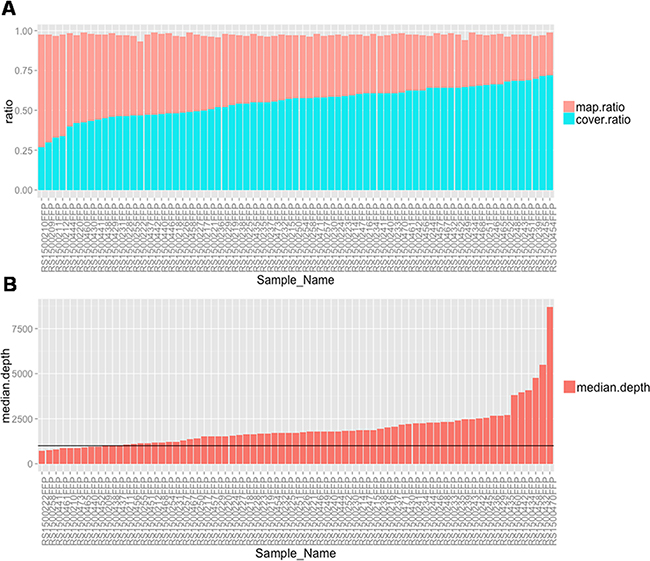 Figure 2: Quality assessment of the targeted sequencing data among 75 samples. (A) Histogram show the percentage of all mapped reads and percentage of reads mapped to target regions for every sample. (B) Bar plot of The median coverage depth among all the target regions for each sample.