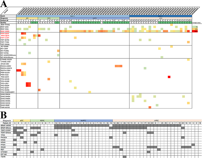 A total of 75 FFPE samples were profiled and only 2 samples from 2 patients (1HVPTC and 1ATC patient) failed sequencing. 73 samples from 55 patients were successfully analyzed, with 29 samples from 17HVPTC patients, 26 samples from 26 CPTC patients, 9 samples from 7PDTC patients and 9 samples from 5 ATC patients. In 16 patients, we obtained more than one FFPE sample from the same patient to investigate the concordance of molecular profiling and possible spatial heterogeneity of these thyroid tumors.
