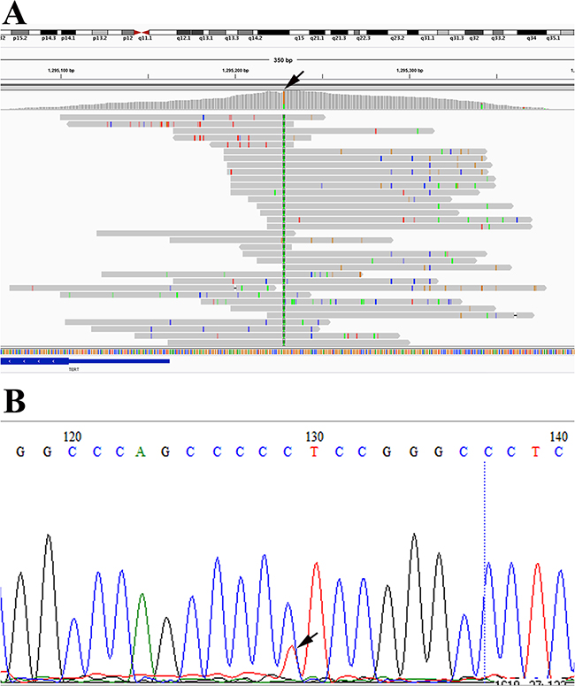Figure 5: Detection of TERT promoter mutation (C228T) in RS1500212FFP by NGS (A) and Sanger sequencing (B), respectively.