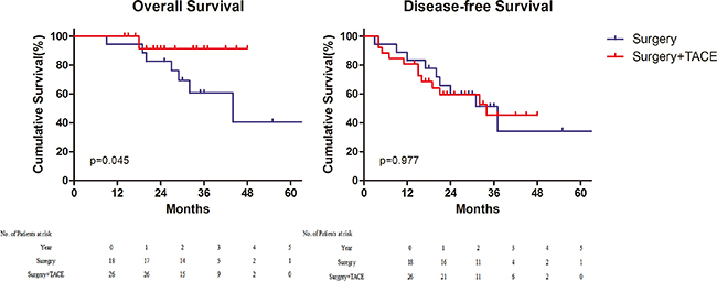 Figure 4: Survival for patients with immunohistochemical alpha–fetoprotein positive. Overall survival (Left) and Disease–free survival (Right). TACE, Transcatheter Arterial chemoembolization.