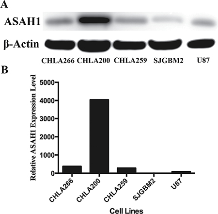 Figure 1: Patient derived pediatric brain tumor cells express high levels of ASAH1. (A) Western blot of 4 patient derived pediatric brain tumors and 1 adult glioblastoma cell line (U87) are shown. The blot was overexposed to show the faint ASAH1 band from SJGBM2 cells. (B) Quantitation of the relative ASAH1 expression level was performed with ImageJ. CHLA200 cells express many folds higher level of ASAH1 than other tumors.
