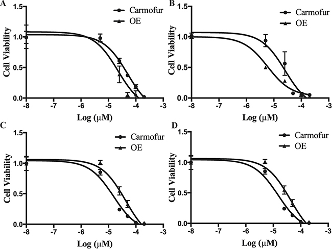 Cells were plated onto a 96-well plate at the density of 1 × 105 cells/ml. Media was exchanged to serum-free media after overnight incubation. Cells were treated with various drugs (OE, carmofur) dissolved in DMSO for 24 hours. MTT reagents were added after 24 hours of incubation, followed by acidic-isopropanol 4 hours later to dissolve formazan. All wells contained less than 0.2% of final concentration of DMSO. The absorbance values were recorded at wavelengths 570 and 630 nm. IC50’s were calculated with the GraphPad Prism software.