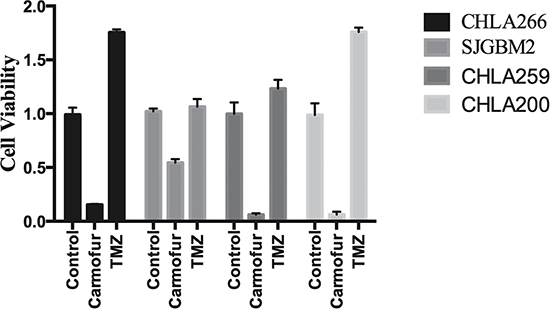 Figure 4: Pediatric brain tumors were more sensitive to carmofur than temozolomide. Cell survival studies using MTT assays of various pediatric brain tumors are shown for control cells vs cells treated with 50 μM of carmofur and 100 μM of TMZ. Results are expressed as means and ± s.e.m (N = 3).