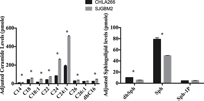 Figure 5: A high level of ASAH1 is associated with a lower level of its substrates and a higher level of its endproducts, ceramides and sphingosines, respectively. Cell pellets were prepared and lipids were extracted for mass spectrometry as described in Materials and Methods. Intracellular ceramide and sphingolipid levels are from CHLA266 (black bars) and SJGBM2 (gray bars) cells. These levels were adjusted for equal loading based on the phosphate level. Results shown are mean ± SD of three replicates. *P < 0.05.