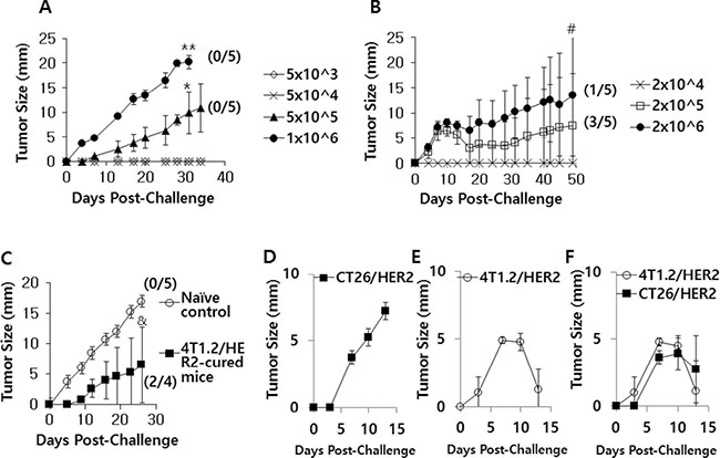 Figure 1: The tumor growth patterns of CT26/HER2 vs. 4T1.2/HER2 cells in mice. BALB/c mice (n = 5/group) were challenged s.c with 5 × 103 to 1 × 106 CT26/HER2 cells per mouse (A) and 2 × 104 to 2 × 106 4T1.2/HER2 cells per mouse (B). (C) The 4 tumor (4T1.2/HER2)-cured mice from Figure 1B were re-challenged s.c. with 1 × 106 CT26/HER2 cells per mouse at 50 days post-challenge, along with 5 naïve mice. Tumor-cured animals were denoted as those showing complete tumor eradication at 50 days following tumor cell challenge. (D–F) BALB/c mice (n = 5/group) were challenged s.c with 5 × 105 CT26/HER2 cells per mouse in the right flank (D), 2 × 105 4T1.2/HER2 cells per mouse in the left flank (E) or both (F). Tumor sizes were measured over time. The values and bars represent tumor sizes and SDs, respectively. The numbers in (/) denote the number of mice without tumors/the number of mice tested. *Statistically significant compared with 5 × 104 cells per mouse. **Statistically significant compared with 5 × 105 cells per mouse. #Statistically significant compared with 2 × 104 cells per mouse. &Statistically significant compared with naïve control.