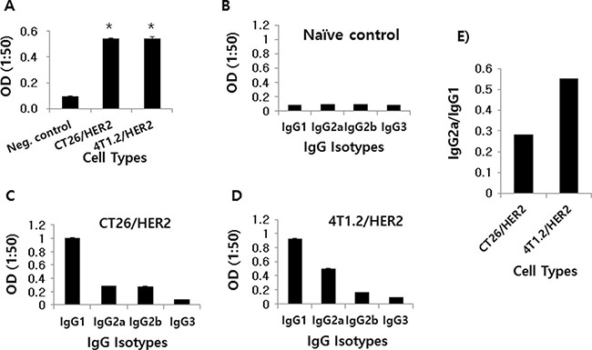 Figure 2: Ag-specific IgG and IgG isotype production in mice challenged with CT26/HER2 vs. 4T1.2/HER2 cells in vivo. BALB/c mice (n = 5/group) were challenged s.c with 5 × 105 CT26/HER2 cells and 2 × 105 4T1.2/HER2 cells. The animals were bled at 20 days post-challenge. Equally pooled sera were reacted with recombinant HER2 protein to measure total IgG (A) and IgG isotypes (B–D) in ELISA. (E) shows the ratio of IgG2a to IgG1. *Statistically significant compared with negative control.