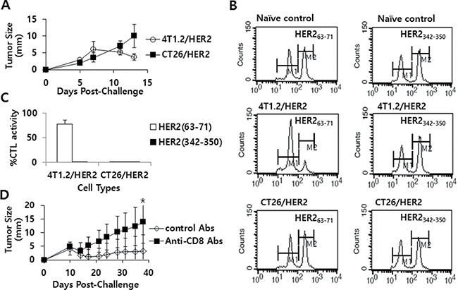 Figure 4: The tumor growth patterns of CT26/HER2 vs. 4T1.2/HER2 cells over time, the Ag-specific CTL lytic activity in vivo and the effect of CD8+ T cell depletion on tumor regression in mice challenged with 4T1.2/HER2 cells. BALB/c mice (n = 5/group) were challenged s.c with 5 × 105 CT26/HER2 cells per mouse and 2 × 105 4T1.2/HER2 cells per mouse. Tumor sizes were measured over time (A). The mice were tested for in vivo CTL lytic activity for 48 h at 11 days post-challenge, as described in the Methods and Materials (B). (C) shows %CTL activity in response to HER263-71 and HER2342-350. The values and bars represent tumor sizes or %CTL activity, and SDs, respectively. (D) BALB/c mice (n = 5/group) were challenged with 2 × 105 4T1.2/HER2 cells per mouse and then injected with 100 μg of control or anti-CD8 Ab at 9, 12 and 15 days post-challenge. Tumor sizes were measured over time. The values and bars represent tumor sizes and SDs, respectively. *Statistically significant compared to control Abs.
