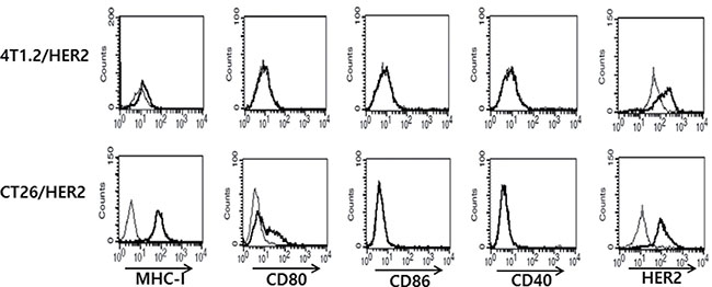 Figure 6: MHC-I, CD80, CD86, CD40 and HER2 antigen expression levels on the surface of 4T1.2/HER2 vs. CT26/HER2 cells. Five × 105 tumor cells were reacted with FITC-labeled anti-MHC-I (thick line) and isotype control (thin line) Abs and with PE-labeled anti-CD80, anti-CD86, anti-CD40 Abs (thick line) and isotype control Abs (thin line). For HER2 expression, the cells were treated with anti-HER2 mouse serum (thick line) or control serum (thin line), followed by treatment with FITC-labeled anti-mouse IgG.