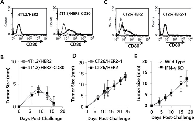 To investigate whether CD80 might be negatively associated with tumor regression, we transfected 4T1.2/HER2 cells with pCEP4-CD80 and selected a tumor cell clone expressing CD80 for use in a tumor cell challenge study. As seen in Figure 7A, 4T1.2/HER2 cells transfected with pCEP4-CD80 expressed CD80 on the cell surface, which did not occur in wild type 4T1.2/HER2 cells. When CD80-expressing and CD80-non-expressing 4T1.2/HER2 cells were injected into animals, they formed tumors that subsequently regressed in a similar fashion (Figure 7B). This result suggests that CD80 has no direct role in tumor regression in the 4T1.2/HER2 tumor model. Previously, we selected CT26/HER2-1 cells that did not express CD80 on their surface [28], as shown in Figure 7C. We challenged mice with CT26/HER2 and CT26/HER2-1 cells and measured the sizes of the tumors. As shown in Figure 7D, there was no difference in the tumor growth patterns between the 2 tumor cell types, suggesting that CD80 is not associated with tumor progression in the CT26/HER2 tumor model. Therefore, these in vivo data show that CD80 is not associated with tumor progression or regression in the two tumor models (4T1.2/HER2 and CT26/HER2). Moreover, when IFN-γ knockout mice were challenged with CT26/HER2 tumor cells, they displayed tumor growth in a manner similar to wild type mice (Figure 7E). Therefore, this result indicates that IFN-γ is also not associated with tumor progression in the CT26/HER2 tumor model.