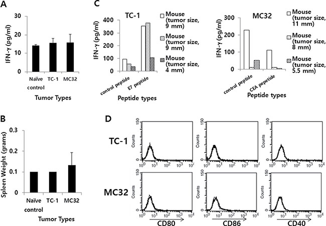 Figure 8: IFN-γ and the expression level of co-stimulatory molecules in TC-1 and MC32 tumor models. (A) Each group of C57BL/6 mice (n = 3/group) was challenged s.c. with TC-1 and MC32 cells (5 × 105 cells/mouse). When tumor sizes reached 7–8 mm in mean diameter (9, 9 and 4 mm for TC-1 tumor; 11, 8 and 5,5 mm for MC32 tumor), the mice were bled and sera were collected to measure systemic IFN-γ levels using ELISA. (B) The mice were sacrificed to measure their spleen weights. (C) The splenocytes were isolated and reacted for 2 days with class I CTL peptides (control CEA vs. E7 peptides for TC-1 tumor; control E7 vs. CEA peptides for MC32 tumor). The collected cell supernatants were used to measure IFN-γ levels using ELISA. (D) Five × 105 TC-1 and MC32 tumor cells were treated with PE-labeled anti-CD80, anti-CD86 and anti-CD40 (thick line), as well as control Abs (thin line) to measure the expression of CD80, CD86 and CD40 molecules using a flow cytometer. The values and bars show IFN-γ levels or spleen weights, and SDs, respectively.