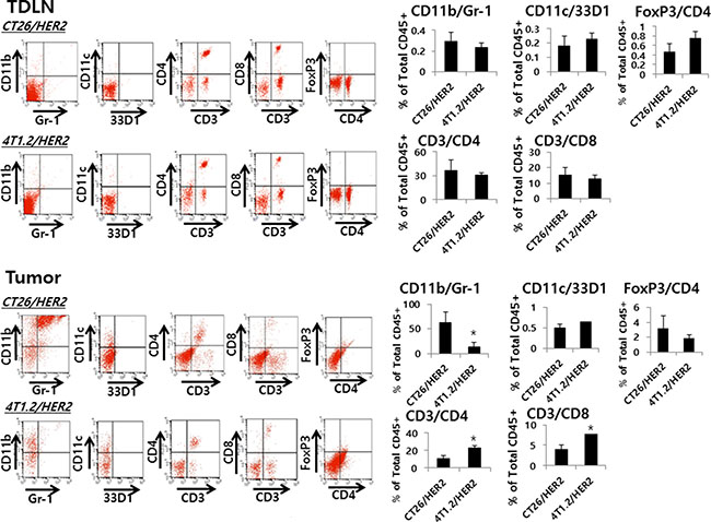 Figure 9: Myeloid and lymphoid cell populations in TDLNs and tumors from CT26/HER2 and 4T1.2/HER2 tumor-bearing mice. BALB/c mice (n = 5/group) were challenged with 5 × 105 CT26/HER2 cells per mouse and 2 × 105 4T1.2/HER2 cells per mouse as in Figure 4A. At 12 days post-challenge, the mice were sacrificed and tested for the percentage of myeloid cells (CD11b+/Gr-1+ and CD11C+/33D1+ cells) and lymphoid cells (CD3+/CD4+, CD3+/CD8+ and CD4+/FoxP3+ cells) among anti-CD45 Ab-gated cells in the TDLNs and tumors of each mouse, as described in the Methods and Material. The values and bars represent mean cell percentages among total CD45+ cells and SDs, respectively. *Statistically significant compared with CT26/HER2.
