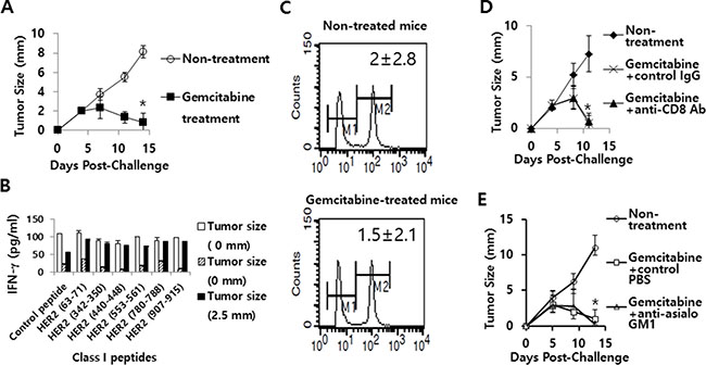 Figure 10: The effects of gemcitabine on tumor growth, IFN-γ induction and CTL lytic activity in responses to HER2 class I peptides, as well as the role of CD8+ T and NK cells in gemcitabine-induced tumor regression. (A) BALB/c mice (n = 6/group) were challenged s.c. with 5 × 105 CT26/HER2 cells per mouse. The mice were injected twice a week for 2 weeks starting from day 5 of post-tumor challenge with gemcitabine. Tumor sizes were measured over time. The values and bars represent mean tumor sizes and SDs, respectively. (B) At 14 days following tumor cell challenge (from Figure 10A), the 3 tumor-regressed mice were sacrificed to obtain spleen. Splenocytes were isolated and stimulated in vitro with different HER2 class I peptides or control E7 peptides. After 2 days of stimulation, the cell supernatants were collected and measured for IFN-γ levels. The values and bars represent IFN-γ levels and SDs, respectively. (C) At 14 days following tumor cell challenge (from Figure 10A), the 3 remaining tumor-regressed mice receiving gemcitabine treatment, as well as the 3 un-treated control tumor-bearing mice were tested for in vivo CTL lytic activity in response to HER263-71. (D, E) BALB/c mice (n = 5/group) were challenged s.c. with 5 × 105 CT26/HER2 cells per mouse. The mice were injected twice a week for 2 weeks starting from day 5 of tumor challenge with gemcitabine. Animals were also injected i.p. with anti-CD8 (D) and control Abs at 2, 5 and 8 days post-challenge, and anti-NK (E) and control PBS at 2, 5 and 10 days post-challenge. Tumor sizes were measured over time. The values and bars represent mean tumor sizes and SDs, respectively. *Statistically significant compared to non-treatment.