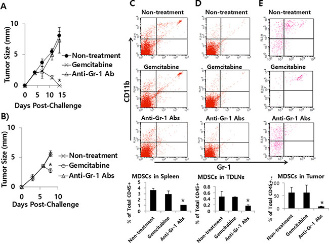 Figure 11: The effects of gemcitabine and anti-Gr-1 Ab treatment on tumor growth and MDSC levels in the spleen, TDLN and tumor. (A) BALB/c mice (n = 5/group) were challenged s.c. with 5 × 105 CT26/HER2 cells per mouse. The mice were injected twice a week for 2 weeks starting from day 5 of post-tumor challenge with gemcitabine. The mice were also injected with anti-Gr-1 Abs at 4 and 11 days post-challenge. Tumor sizes were measured over time. The values and bars represent mean tumor sizes and SDs, respectively. (B–E) BALB/c mice (n = 5/group) were challenged s.c. with 5 × 105 CT26/HER2 cells per mouse. When tumor sizes were approximately 3.5 mm at 6 days post-challenge, the mice were injected with gemcitabine and anti-Gr-1 Abs. Tumor sizes were measured at 8 days post-challenge (B) and the mice were subsequently sacrificed to measure MDSC levels in the spleen (C), TDLN (D) and tumor (E) of each mouse. The values and bars represent mean tumor sizes and MDSC levels, and the SDs, respectively. *Statistically significant compared to non-treatment.