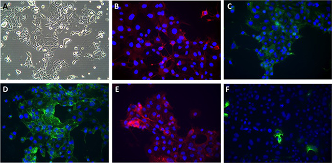 Figure 1: Phenotypic appearances of NUOC-1 cells. (A) Brightfield demonstrating cobblestone monolayer (20x magnification); immunoflourescent images (40x magnification) with antibodies targeted against: (B) Alexafluor 596 anti-CA125; (C) FITC-anti-pancytokeratin; (D) Alexflour 488 anti-EpCAM; (E) Alexafluor 596 anti-MOC 31; (F) Alexaflour 596 anti-Vimentin.