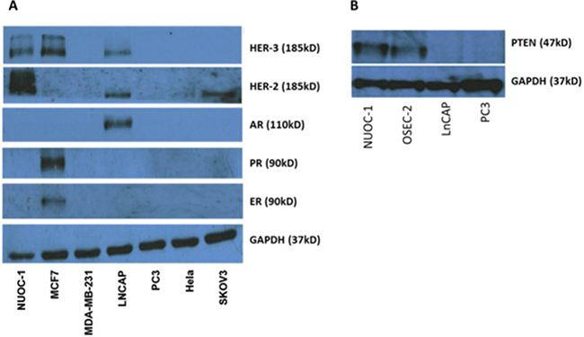 Figure 2: Receptor expression in NUOC-1 cell line assessed by western blotting. (A) Tyrosine and endocrine receptor expression in the NUOC-1 cell line. NUOC-1 cells express the Her-3 receptor (positive control MCF7) and overexpress the Her-2 receptor (positive control LNCAP and SKOV-3). NUOC-1 cells do not express the oestrogen receptor (positive control MCF7), the progesterone receptor (positive control MCF7) or the androgen receptor (positive control LNCAP). (B) PTEN expression levels in NUOC-1 cells demonstrated by Western blot analysis. LNCAP and PC3 cells serve as negative controls whilst OSEC-2 is a positive control. Blots are representative of three independent experiments.