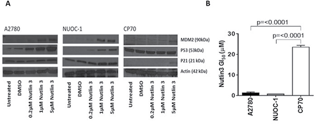 Figure 3: p53 function in NUOC1 cells. (A) Activation of MDM2, p53 and p21 protein in response to Nutlin3 treatment assessed by western blotting. Images are representative of 3 independent experiments. (B) Growth inhibition induced by Nutlin3 treatment in NUOC-1 cell line assessed by SRB assay. The inhibition in NUOC-1 is compared to p53 wild type A2780 and p53 mutant CP70 cell lines. Results are the average of 3 independent experiments repeats. Error bars are SEM.