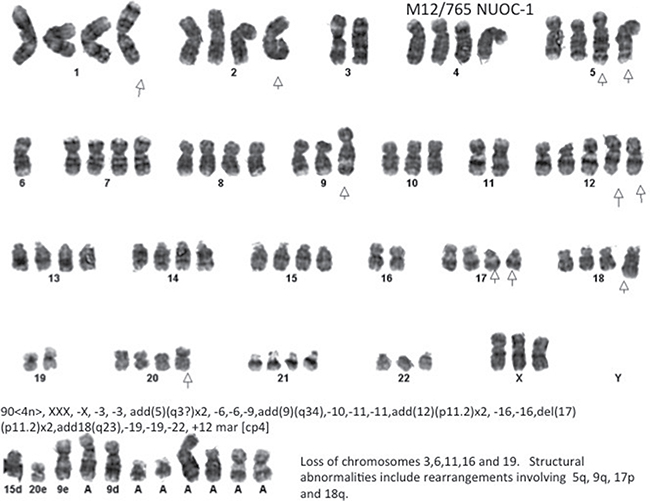 NUOC-1 cells revealed a complex, near-tetraploid karyotype, with loss of chromosomes 3,6,11,16 and 19, and structural abnormalities including rearrangements of 5q, 9q, 17p and 18q (Figure 5).