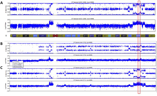 Figure 6: Copy number profile of chromosome 8 in (A) NUOC-1, (B) NUOC-1-A1 and (C) NUOC-1-A2 cell lines. Each SNP marker is represented and aligned to its position on the chromosomes as well as its designated copy number state. An ideogram of chromosome 8 is positioned below the SNP marker plots. Red square – location of c-MYC gene.