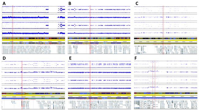 Figure 7: Copy number profiles of NUOC-1-A1 and NUOC-1-A2 cell lines showing Log R ratio and B allele frequency. Each SNP marker is represented and aligned to its position on the chromosomes as well as its designated copy number state. Ideograms of each chromosome are positioned below the SNP marker plots. (A) ARID1A captured by a large region of copy neutral LOH on chromosome 1. (B) PIK3CA located in a region of copy neutral LOH. (C) AKT1, captured by a 155Kb amplicon on chr 14. (D) ERBB2 (HER2), captured by amplicon of 405Kb on chr 17. (E) PPM1D located in a region of apparent copy neutral LOH. (F) HINF1B, captured by amplicon of 115Kb on chr 17.