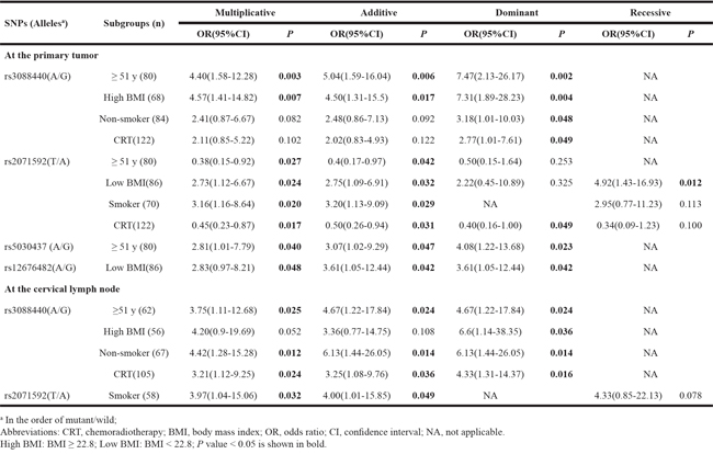 In the subgroup analysis, TRAF6 rs5030437 and IKBKB rs12676482 were associated with less favorable outcome at the primary tumor in patients ≧ 51 years old and patients with BMI < 22.8, respectively. TRAF6 and IKBKB are positive regulators of NF-κB signaling, of which rs5030437 and rs12676482 are both identified in the intron region of corresponding gene. These two SNPs may upregulate the gene expression by affecting mRNA splicing, localization or stability, and reinforce the NF-κB signaling, which facilitates the proliferation of NPC cells and weakens the effect of radiotherapy [55]. Another possible mechanism is that the rs5030437 or rs12676482 is in linkage disequilibrium (LD) with a certain functional variant that really mediates this process [56]. Whatever, there has no report about the correlation between rs5030437 and rs12676482 polymorphisms with the prognosis of NPC, and more studies are requisite to verify the specific mechanism.