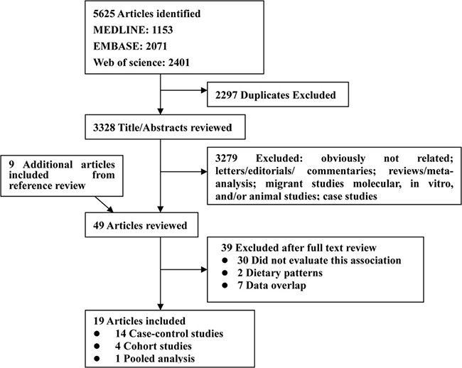 Based on the study selection criteria, we identified 1153 articles from the MEDLINE, 2071 from the EMBASE and 2401 from the web of science database. In addition, 9 more articles were identified by studying the cross-reference lists. After excluding studies that did not meet the inclusion criteria, 19 publications were included in our meta-analysis, including 14 case-control studies, a pooled analysis of 13 prospective studies and 4 cohort studies (Figure 1). We excluded five publications [14, 20, 33–35] in the primary analysis (because they were included in the aforementioned pooled analysis [15]), but included them in the subgroup analysis for genders.