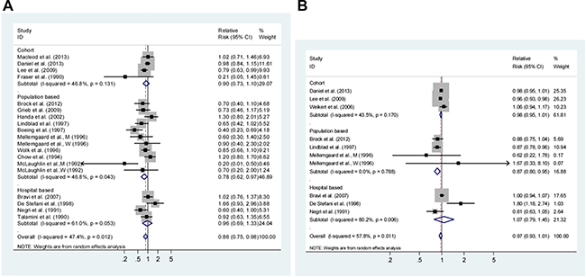 Figure 2: Analysis of vegetables intake with risk of renal cell carcinoma. (A) High vs. Low analysis; (B) Dose-response analyses for intake in increment of 1 serving/day. Studies are sub-grouped according to study design. Squares indicated study-specific risk estimates (size of square reflects the study-statistical weight, i.e. inverse of variance); horizontal lines indicate 95% confidence intervals; diamond indicates summary relative risk estimate with its corresponding 95% confidence interval.