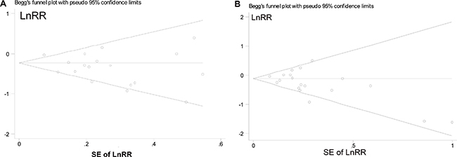 Figure 4: Begg’s funnel plots of the log relative risks (RRs) versus the SEs of the log RRs in studies that evaluated the effect of vegetables (A) and fruit (B) intakes on the risk of renal cell carcinoma.