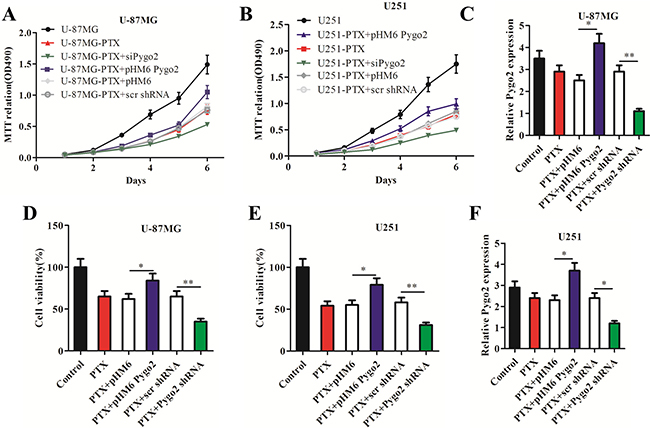 Figure 1: Pygo2 promotes the proliferation of glioma cells treated with paclitaxel. Six groups of cells (PTX, PTX+ pHM6-Pygo2, PTX+Pygo2 shRNA, PTX+pHM6, PTX+scr shRNA) were seeded at a density of 1×105 cells/well in 6-well plates and treated with 30 nM PTX for 48 h; normal cells were used as a control. (A–B) An MTT assay revealed that Pygo2 counteracted the effect of PTX-induced cell growth arrest in human glioma U-87MG or U251 cell lines. (C, F) qRT-PCR showed the relative Pygo2 mRNA expression level in the treated cell lines. Pygo2 expression was normalized to β-actin. (D–E) Pygo2 rescued the cell viability of U-87MG and U251 cells. Data are presented as the mean ± SD of three independent experiments. Two-tailed Student’s t-test was used; *P < 0.05 and **P < 0.01.